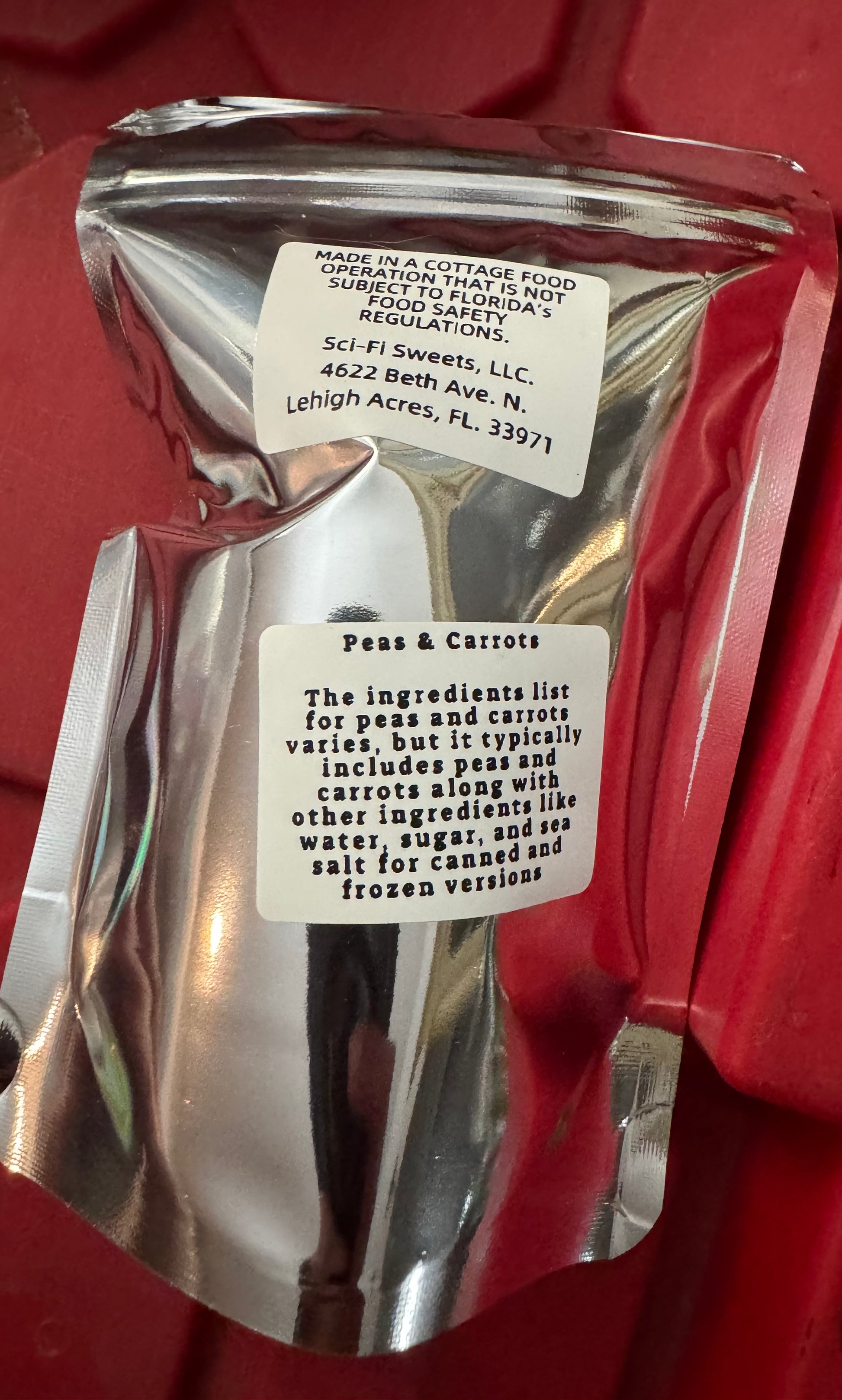 Fresh peas and carrots mix freeze dried!! Yummy for a snack or add to some broth for soup!!